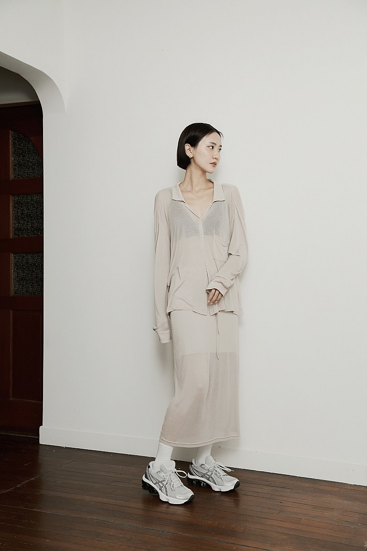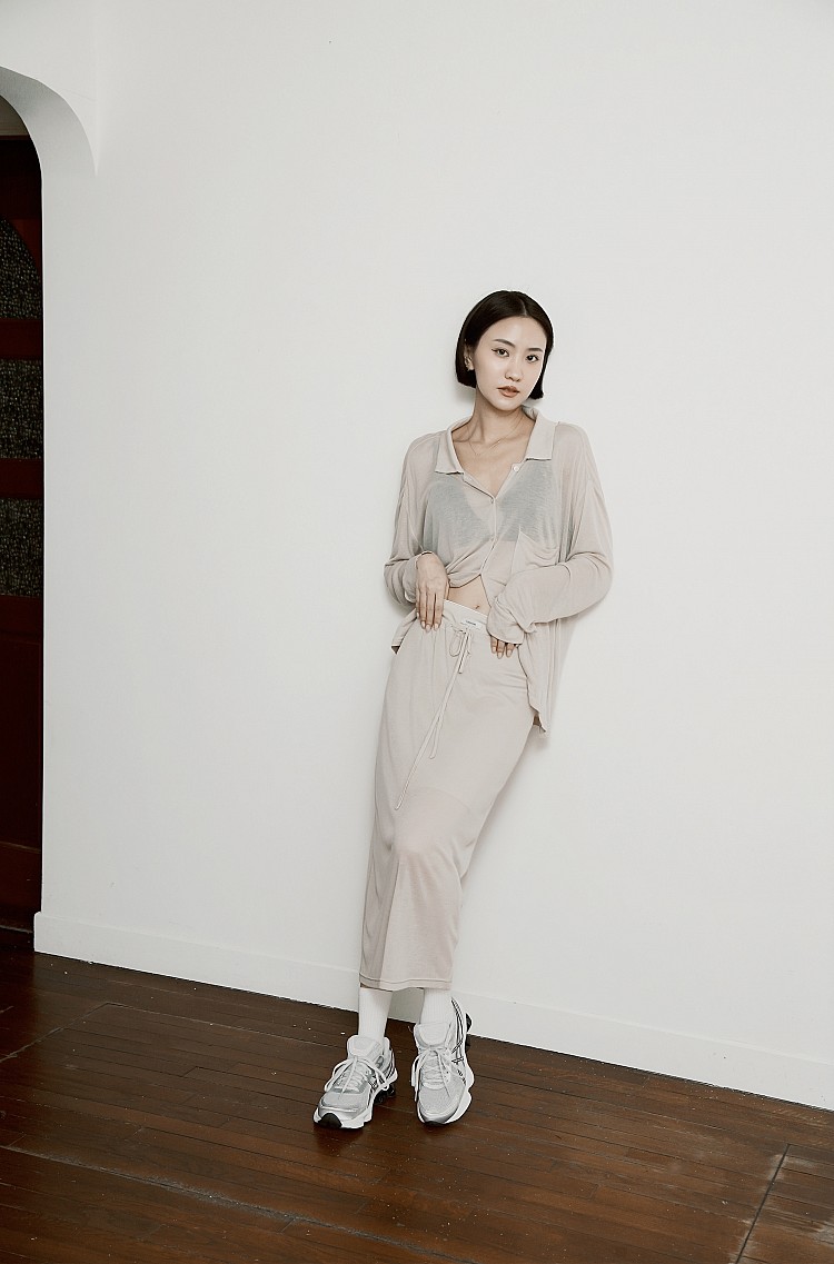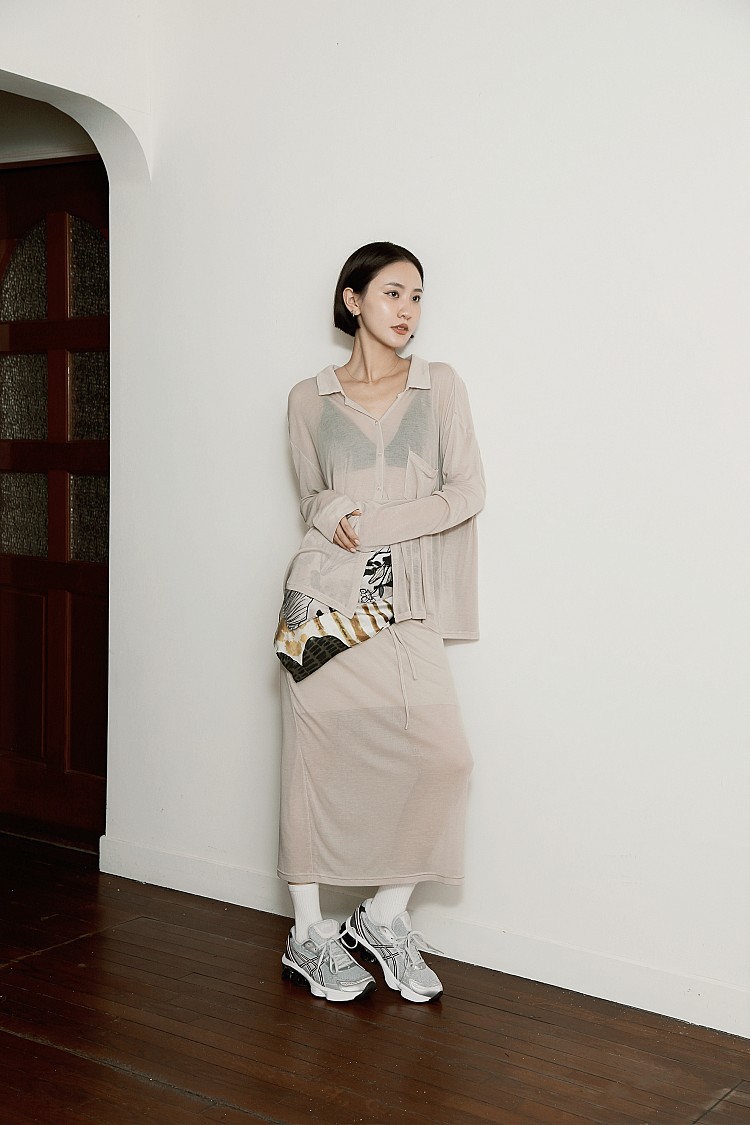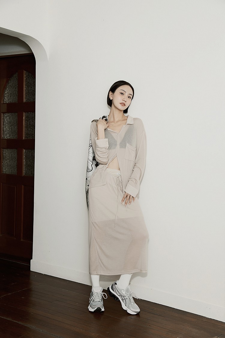 以淺色透感套裝開啟悠閒假日,輕盈材質讓造型更顯隨性與自在。不論是美術館看展,或是在午後咖啡廳聚會,都能展現都會時髦感,腳上搭配話題鞋款GEL-KINETIC FLUENT,修飾腿部線條的流線設計,優雅中注入率性風格。淡粉色鞋身搭配深色線條,強烈的撞色對比,勾勒出鮮明的視覺層次;鞋後跟的盾狀亞瑟膠細節更成為焦點,兼具機能與造型感。
