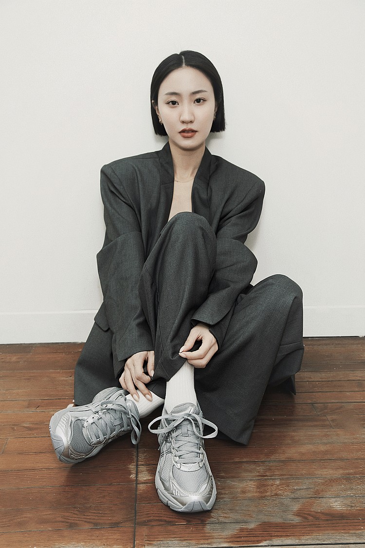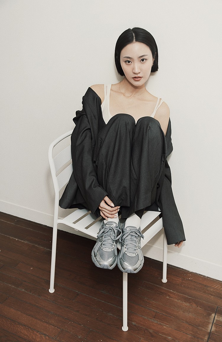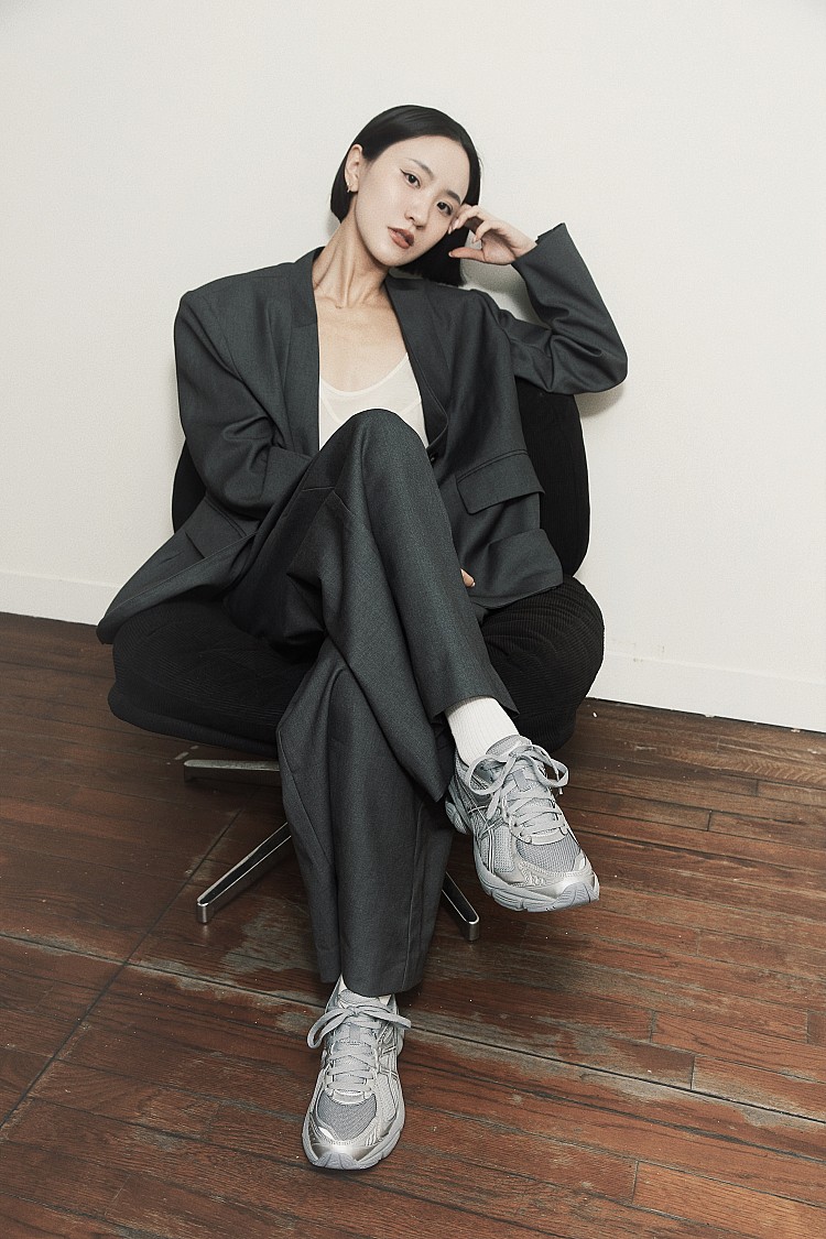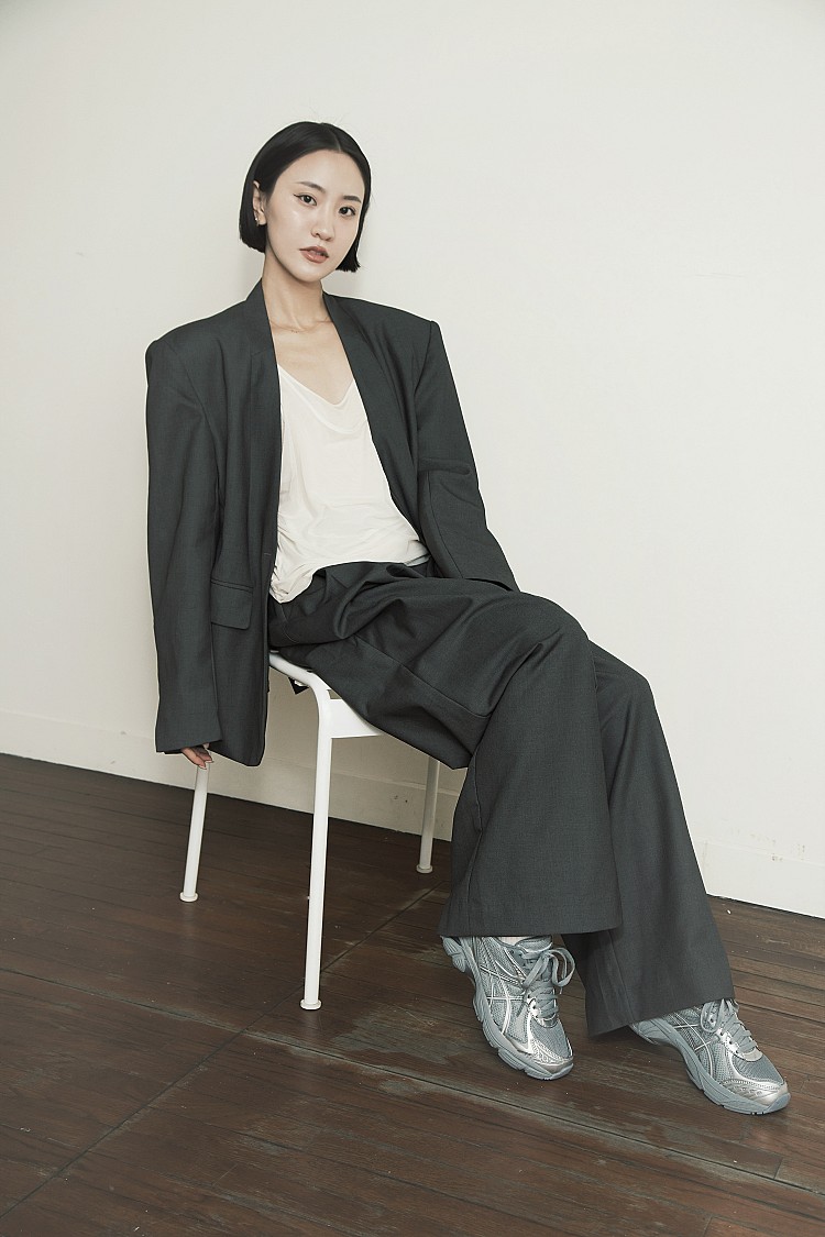第一套YI LU以全套灰色西裝以俐落剪裁勾勒都會姿態,搭配經典人氣款GT-2160復古跑鞋,全銀質感灰色調,灰底配上銀色流線細節,即使同色系也能展現層次魅力與低調質感。不論是正式場合或休閒時刻,都能自由切換。上班時以西裝與襯衫搭出Smart Casual風格,下班換上運動服或輕便外套,轉換為輕鬆的運動模式。