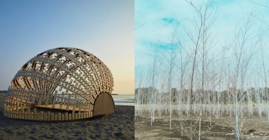 防風林裡的鏡面裝置「秘鏡」,顧名思義是用鏡子做的藝術作品,透過一整排小面積鏡面反射的樹林、灑落的天光,既不凸顯、又融入這片幽靜的隱逸裡。其他遺珠作品還有回憶拼圖、鯤、海中絮語、虹橋、虹樹林、彩色泡泡,只能說這次的「2019年漁光島藝術節」亮點頗具,看一看夕影天穹還有裝置藝術,絕對值回票價。