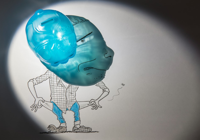 沒想到台灣特產的存錢筒小豬也變成作品,名為《破產與憂鬱》的藝術作品,透過藍色小豬反射出的藍影變成一個沒錢的窮人表情,大概是要反諷時下追求短暫快樂導致存錢筒空空,平時不存錢到了月底口袋沒錢的憂鬱感!