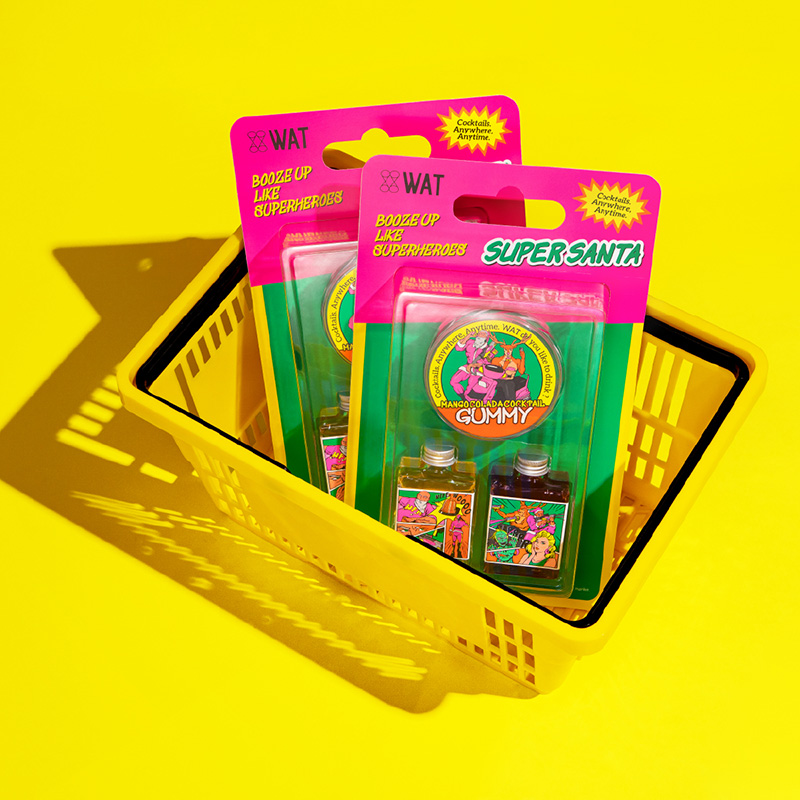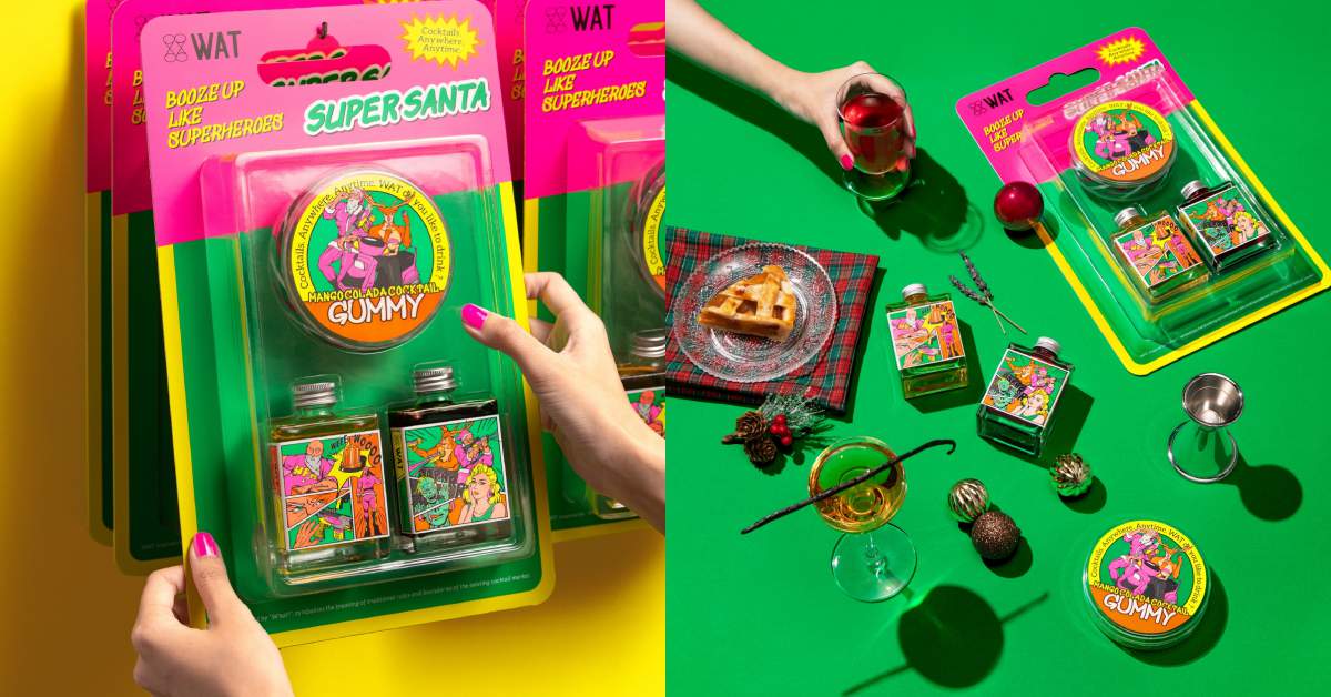 擅長變魔術的WAT才不會就這樣畫下今年的結尾!為因應聖誕節來臨,推出兩款全新調酒「烤蘋果派雞尾酒」、「薰衣草花椒雞尾酒」讓你微醺過聖誕!瓶身以美式漫畫融入酒瓶,趣味風格拿來收藏也很適合。除此之外,還有推出不含酒精的「芒果可樂達」風味雞尾酒瓶造型軟糖,送禮自用都很合適。