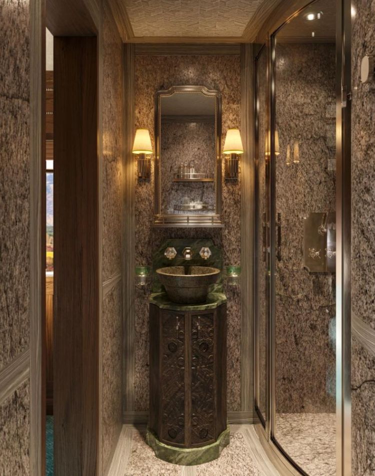 豪華車廂空間充裕,洋溢著蘇格蘭文化中特有的優雅氛圍,並將其壯麗的自然風光注入設計之中。室內設計自旅程目的地採擷靈感,將綠色、灰色、米色和藍色鋪陳於手工牆面、裝飾品和傢俱之上,與沿途的美景色調構成巧妙呼應。奢華浴室由石頭和木材等當地材料打造而成。透過別具一格的裝飾圖案,可窺見愛德華時代的優雅品味、皮克特石頭圖案和凱爾特象徵主義元素。所有精妙的設計皆出自 Tristan Auer 之手。