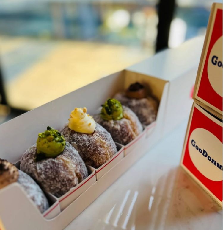 最近在社群爆紅的「GooDonut」是藝人阿Ken開設的甜甜圈店,地點位於台北車站旁邊的公園路,整體走美式潮流風格,從店裝空間再到甜點包裝都很有個性,店內主打爆餡甜甜圈,目前提供卡士達、巧克力和開心果三種口味,外皮撒上滿滿糖粉,蓬鬆麵包體、飽滿內餡配上頂部裝飾,圓滾滾造型裝在紙盒裡時髦又可愛,很適合打卡拍美照,更因為周董分享加持,掀起秒殺熱潮!