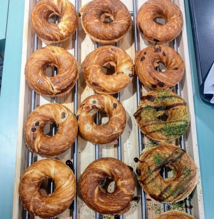 不同於一般甜甜圈大多採用油炸,「MY幾圈甜甜圈」是現烤出爐,一圈圈千層麵衣裹上焦糖,經過烘烤後口感酥脆又香甜,吃起來有點像是奧地利可頌,餅皮充滿層次感又不會甜到很膩口!如果第一次吃,可以從歐式經典的原味、可可開始嘗試,喜歡傳統中式口味也有紅豆、花生和芝麻口味,最特別的是「青苔椒鹽」撒上海苔和椒鹽,鹹香滋味配上微甜糖粒,甜點控絕對會非常滿足!