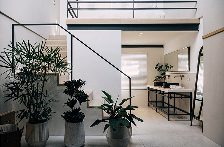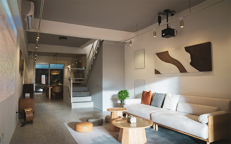 空間中隱藏著時間的語法,下午三點的斜陽會在樓梯角落描出剪影,夜裡燈光則收斂至最溫柔的低照度,為談天與沉思保留私密溫度。家具選用上,民宿捨棄華麗裝飾,轉而擁抱低彩度的橡木、霧黑金屬與藤編,搭配奶白與沙灰牆色,將簡而不空、靜而有力的日式現代風格發揮至極致。一樓的開放式廚房與恆溫戲水池,為白天增添生活的熱度;而夜晚,投影幕與Marshall音響開啟家庭劇院與微醺時光。無論是烹飪、觀影或K歌,這座民宿總能讓人感覺,自己被空間溫柔地接住了。