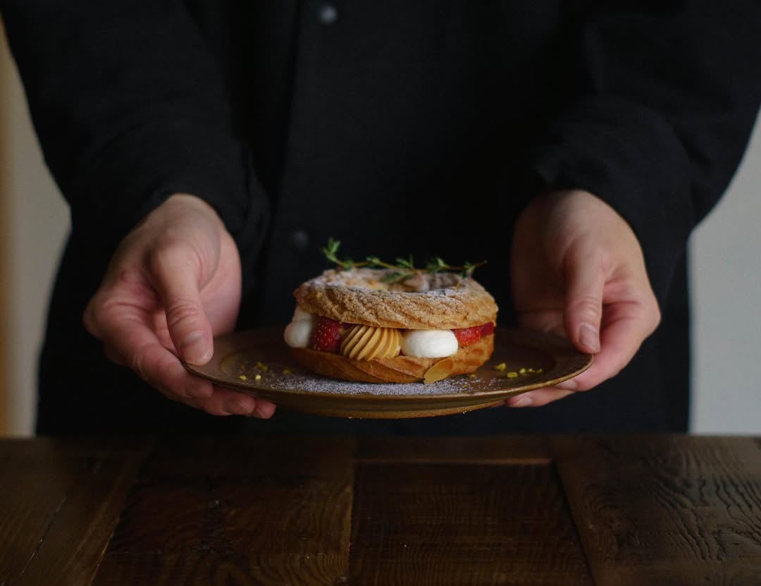 藏身於永和住宅區一樓的「鬧蟬烘豆工作室」,猶如城市中的靜謐秘密基地。空間以木質家具與復古竹編椅背為主,搭配毛玻璃與半圓設計的出餐口,讓視線在每個轉角間流動,處處透露詩意文青氣息。「焦糖草莓開心果布列斯特」內餡選用招牌焦糖穆斯林奶油餡,絲滑香濃中透著焦糖的微苦,與淡雅的開心果香氣交織出豐富層次。中間點綴香緹鮮奶油與新鮮草莓,不僅帶來酸甜清爽,也恰好中和了焦糖的濃郁感,讓口感更輕盈。配上一杯自家烘焙的手沖或義式咖啡,是鬧蟬空間裡最完整的享受。