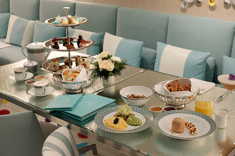 Blue Box Café Taipei隱身在A9 Tiffany & Co.精品店內,宛如步入迷你版紐約第五大道藍盒劇場。空間由設計大師Peter Marino操刀,以Tiffany經典藍為基調,搭配天河石吧台、玻璃藍盒裝置藝術牆與手繪瓷盤群,共同營造一場光澤與細節交織的沉浸式美學體驗;空間雖迷你,卻精緻,每一處都讓人想擁抱品牌的優雅儀式感。在這樣優雅氛圍下品嚐餐點,更像是一場視覺與味覺的夢幻對話:主廚林明健以台灣在地食材融入東方風味,打造從早餐、下午茶到季節性餐點的精緻菜單;招牌三層下午茶包含五款鹹點、六款甜點與司康,搭配咖啡或茶,是一場令人迷醉的舌尖饗宴。
