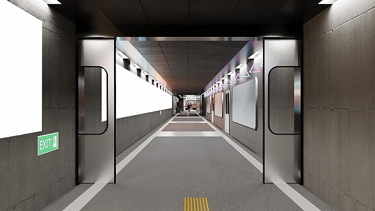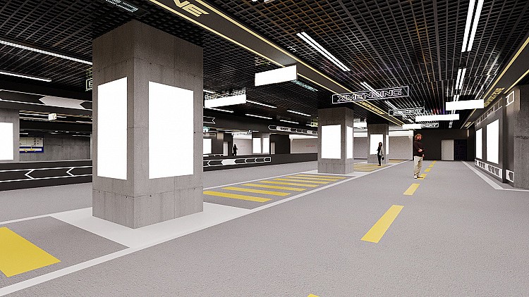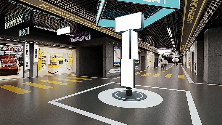 整體空間長達215公尺、面積約931坪,風格以深灰色為基底,輔以霓虹線條與LED螢幕組成未來感的視覺語彙。牆面捨棄傳統磁磚與柱體設計,改以金屬質感與光影交錯呈現,營造科技城市般的沉浸氛圍。天花板霓虹燈交錯流動,地面則融入「斑馬線」與「車道線」圖騰,呼應「地下城」的意象,讓人一踏入就像進入平行時空。
