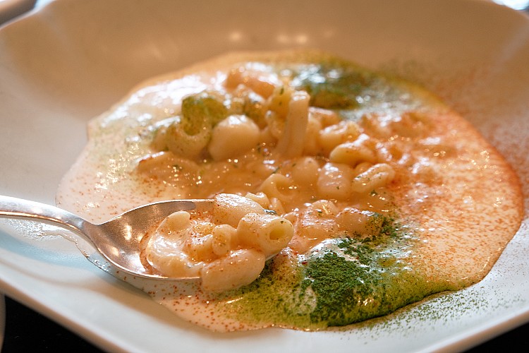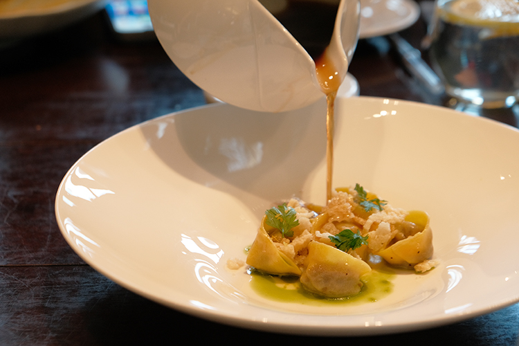 Pasta Mista「手工綜合義大利麵、馬鈴薯、煙燻莫札瑞拉乳酪泡沫」是一道來自義大利家庭餐桌的經典做法,源於拿坡里地區,把形狀各異、份量零散的麵條一起下鍋,講究的是實用與口感的自然層次。馬利歐延續這套傳統邏輯,透過不同麵體交錯出豐富嚼感,並加入馬鈴薯一同燉煮,讓釋放出的澱粉成為湯汁的結構核心,質地柔順卻不厚重。煙燻莫札瑞拉被轉化為乳酪泡沫,帶來克制而內斂的煙燻氣息,替整體風味拉出深度,而非喧賓奪主。這道菜沒有刻意追求華麗表現,而是把義式料理「化平凡為神奇」的精神落實在細節裡,看似日常,卻最能體現主廚對傳統、比例與風味平衡的掌握。