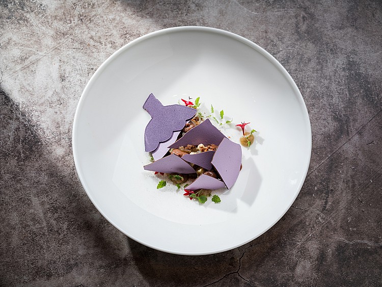 甜點Melanzana「茄子、巧克力、松子、肉桂、海鹽焦糖、香橙干邑酒」取材自南義阿瑪菲海岸的傳統「茄子巧克力」,一款帶著修道院傳說色彩的蔬食甜點。馬利歐並未複製經典,而是從「完整使用一顆茄子」出發,拆解皮、肉與風味層次,轉化為當代盤中語言。茄子皮烘乾磨粉,留下乾淨而低調的香氣;果肉切丁糖漬、再化為海鹽焦糖,柔軟中帶著深色苦甜。松子與肉桂拉出溫潤輪廓,巧克力則成為整道甜點的結構核心,而非主導。入口時,甜與苦、軟與脆自然交錯,風味輕盈卻有記憶點。這是一道被主廚稱為「No Waste Dessert」的作品,不談口號,用味道回應南義料理對食材、季節與生活智慧的尊重,為整餐留下一個安靜卻耐人回味的句點。
