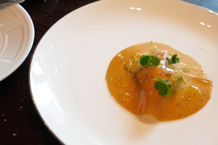 主廚套餐中的Scampo「地中海式海鰲蝦、雞尾酒醬、蘿蔓沙拉、海鮮高湯凍」,是馬利歐職涯的重要座標。螯蝦僅以鹽與胡椒定調,炙烤至半熟,彈嫩的質地成為舞台中央;晶透的海鮮高湯凍如薄霧覆上,橄欖油在最後一刻勾勒香氣輪廓。這道菜沒有多餘修辭,卻把「簡單就是美」說得極其清楚,當食材足夠好,料理的任務只是守護,入口瞬間,甜味被完整保留,鹹度收得極低,留下的是乾淨而悠長的回甘。