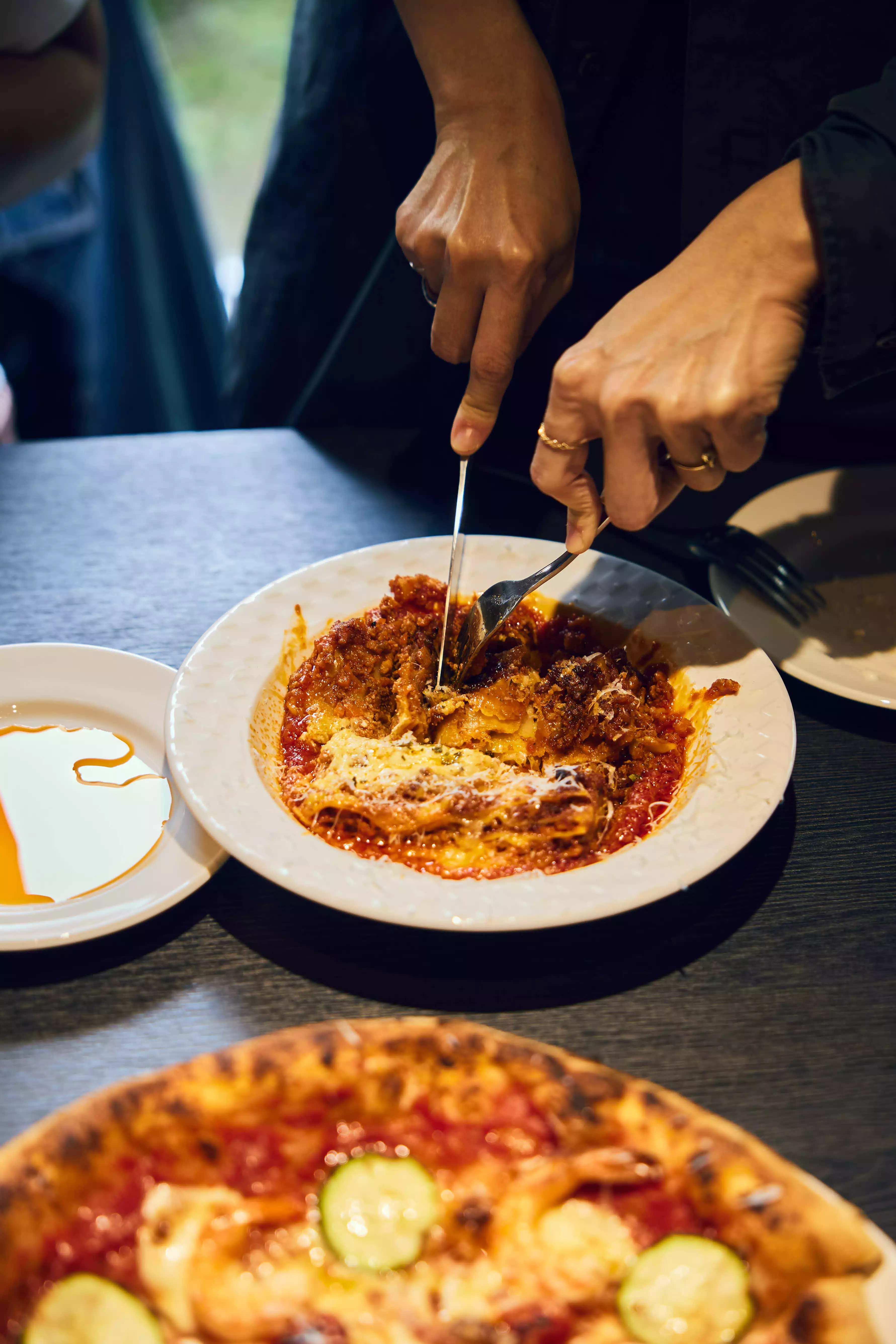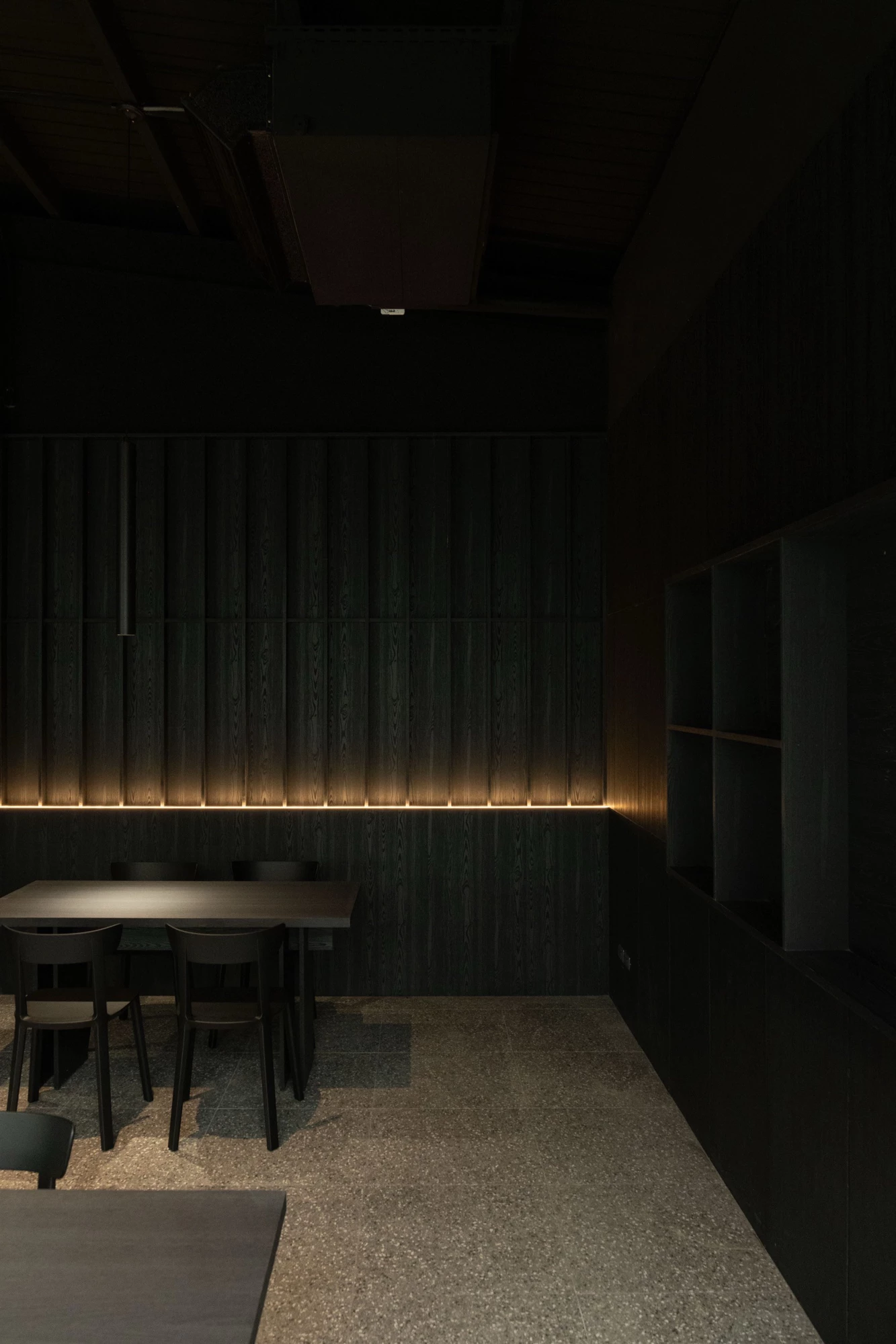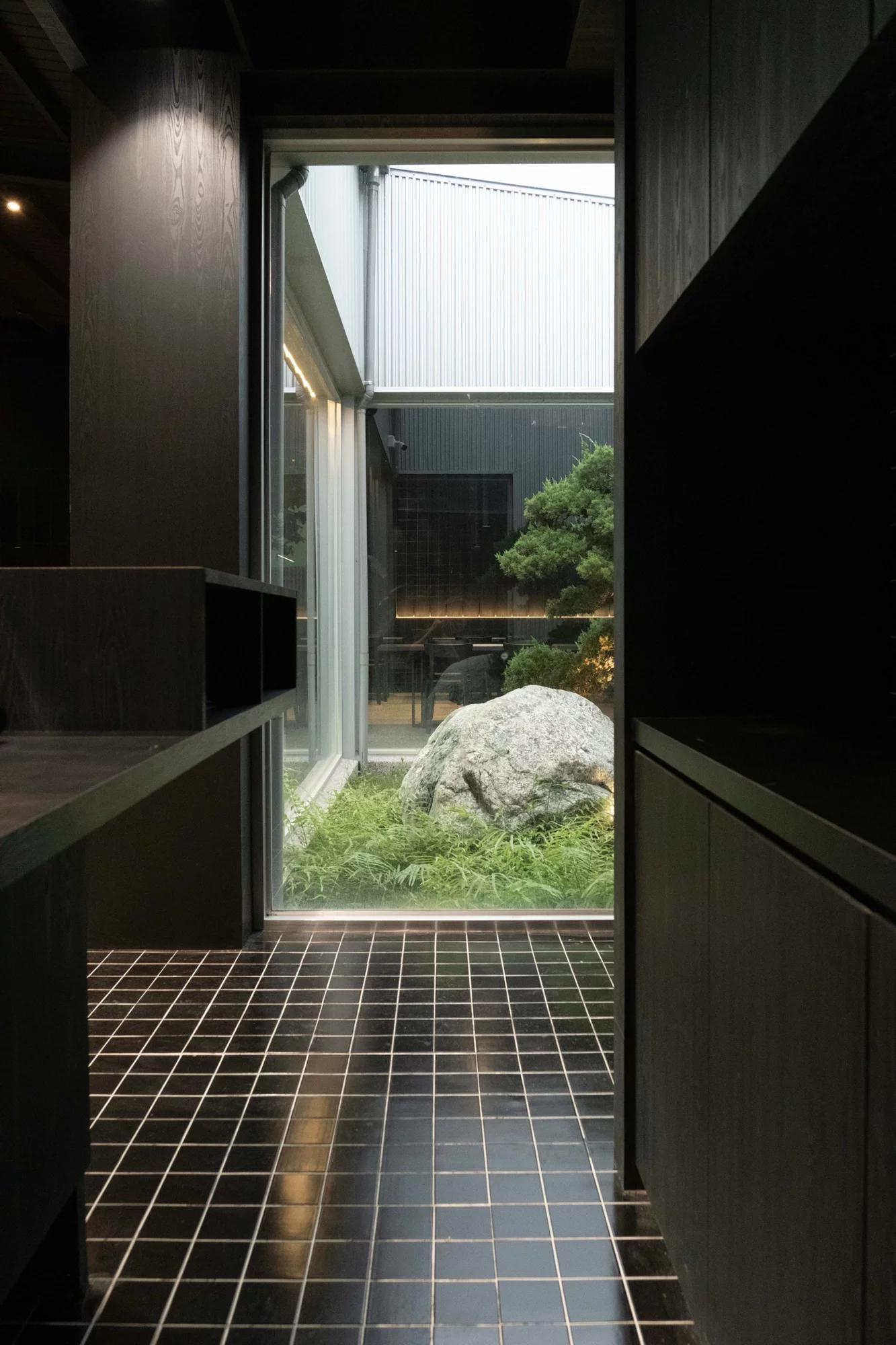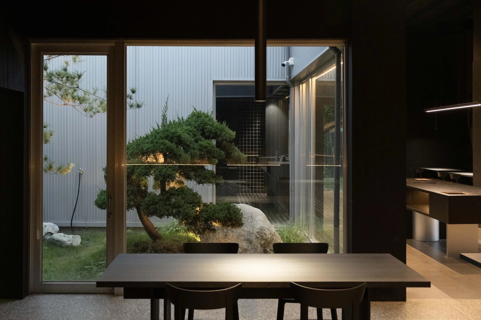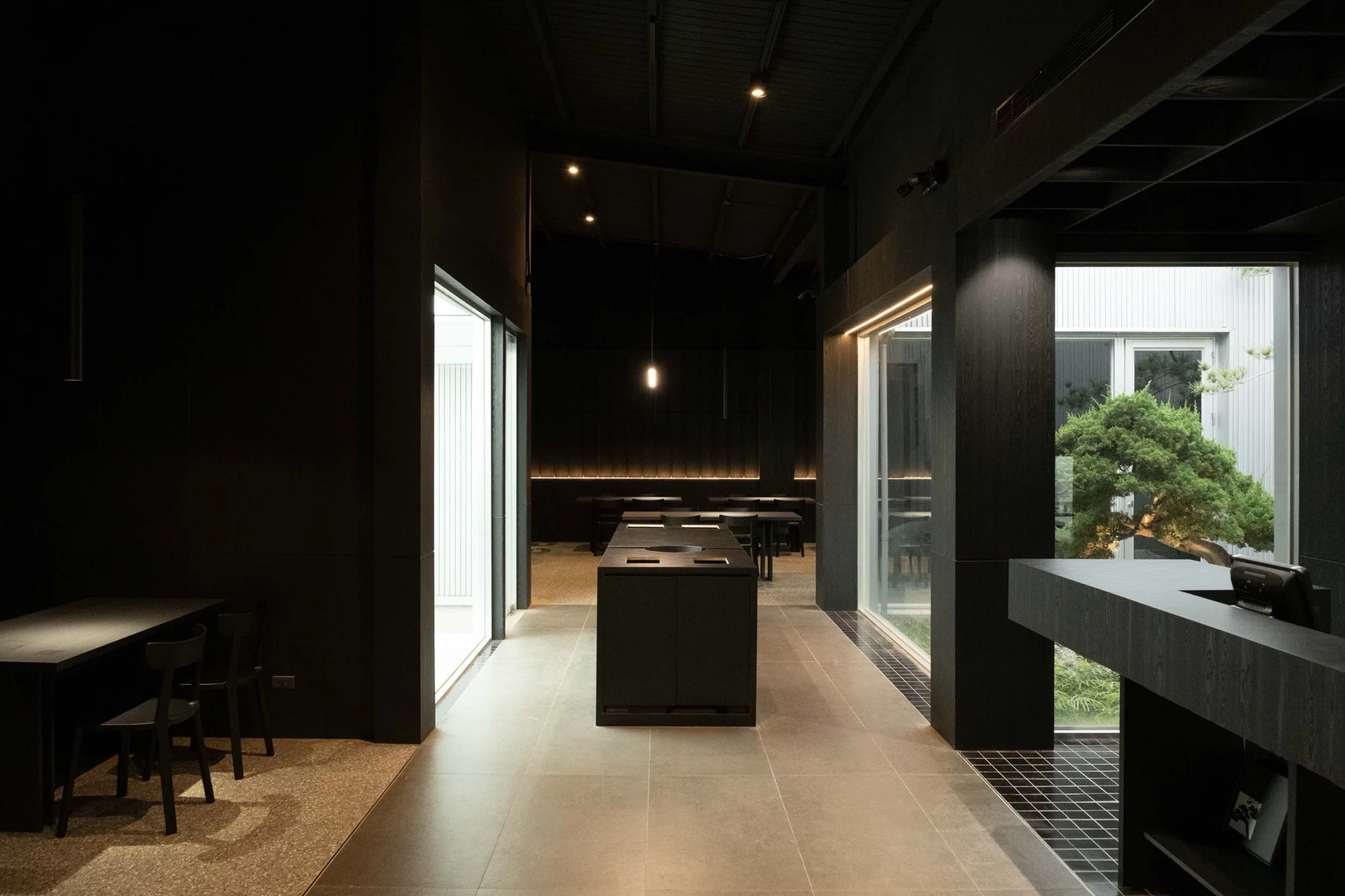 推開門後,讓人記住的,往往不只是披薩香氣,而是光。整體室內以近乎全黑色調鋪陳,從牆面、天花到家具,刻意壓低視覺亮度,讓空間呈現近似劇場般的沉靜氛圍,然而就在這樣的深色背景中,天井與天窗成為最戲劇性的存在。陽光從高處筆直灑落,在黑色空間中形成一道極具張力的光束,讓時間與天氣的變化,悄悄在室內留下痕跡。明與暗、封閉與開放的對比,讓人感受到某種刻意安排的平衡感。空間裡的一松一柏,也在這樣的光影中顯得格外安靜,像是對時間的一種隱喻,或許與你想像中典型的舒適餐廳不同,而更像是一個讓人放慢節奏、重新感受感官的場所,甚至讓吃披薩這件原本輕鬆的事,多了一層情緒與氛圍。