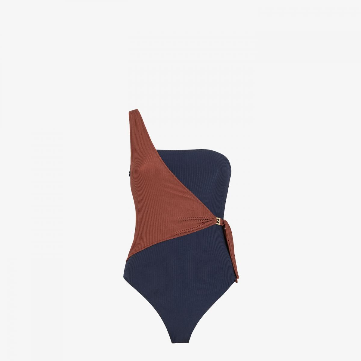 倘若喜歡沒有太多Logo的簡約路線,Fendi 這件單肩連身泳衣是儂編非常推薦的款式,光是海軍藍和焦糖棕的對比設計就亮眼驚艷,精準選色、獨特剪裁、條紋細節更讓泳裝質感再加分,尤其腰側的結飾設計和FF金屬細節是畫龍點睛的精緻巧思,完全是氣質派女孩的首選!(價格:NT$25,600)