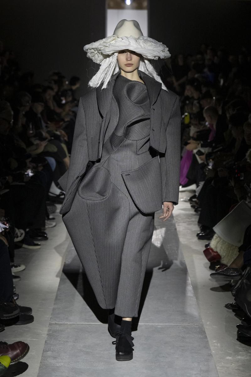 川久保玲作為最早期進入巴黎時裝週的設計師,其前衛的風格至今仍持續為時尚圈帶來驚喜。在今年三月的秋冬秀場中,她拆解西裝外套,將其面料以像是雕塑品的形式呈現,透過領片、肩線等細節,仍可看出 “西裝” 的元素,但端看總體的設計,西裝外套早已不是西裝外套,而是一件能送進美術館的作品。