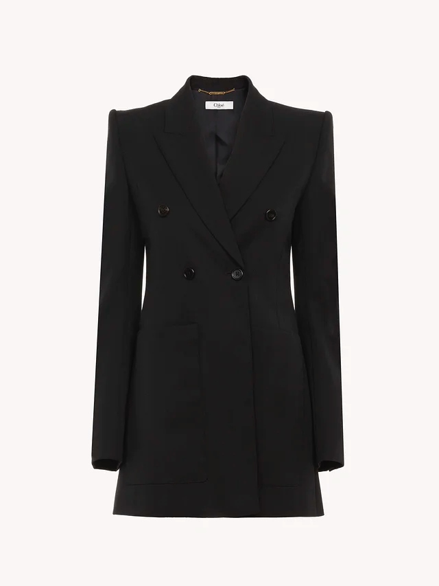 Chloé 呈現一件極具力量感的黑色雙排釦外套,以直線剪裁延伸身形比例,打造幹練俐落的氣場。長版設計融合了都會感與現代女性氣質,適合搭配襯衫與長靴,體現優雅中的剛強。(價格店洽)