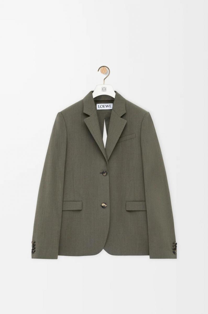 這件來自 Loewe 的軍綠色西裝外套簡約而不單調,兩顆釦子與柔和的色彩賦予其一種自然實穿的中性美。適合搭配高腰褲或連身裙,是日常休閒與文藝風格愛好者的首選。(商品售價:NTD66,000)