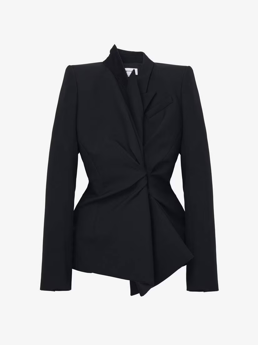 這款來自 Alexander McQueen 的西裝外套,是新任創意總監 Seán McGirr 上任後最令人印象深刻的作品,戲劇性的立體扭結設計,象徵英國濕冷天氣下,人們抓緊衣襟的褶皺,整體帶有雕塑感剪裁,展現品牌過往倫敦塞維街訂製西服的工藝,極具視覺張力的女性輪廓,非常適合時尚秀場或高端晚宴,是一件具有藝術品味的西裝外套。(價格店洽)