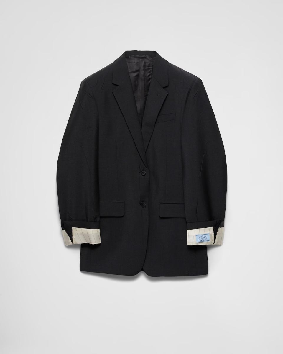 這款 Prada 西裝外套以寬鬆結構打造隨興中性的廓形,翻袖內襯為條紋布料設計,外露穿搭時展現低調細節美學。輕鬆與正式兼具,是都會風格的實用單品,適合打造高級休閒感。(商品售價:NTD140,000)