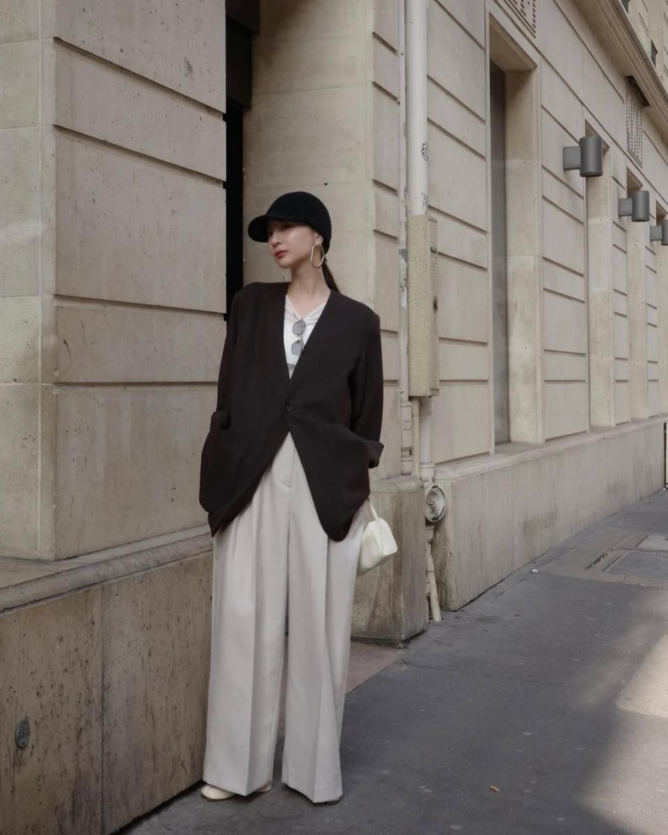 日系穿搭一直以來就是台灣女生搭配的參考質,2018 年自創了服飾品牌 Louren 的日本部落客 Suzumi Sato,在私著穿搭上便以單純的黑白兩色為基底,藉由落地寬褲拉長比例後,再以無領西裝作為搭配,簡約又充滿氣質的風格,可列入搭配參考。
