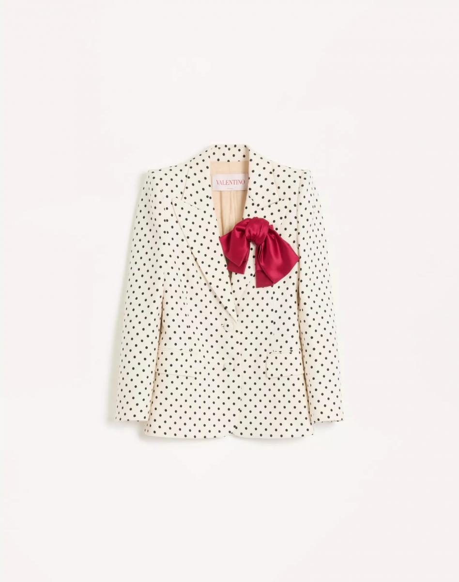 Alessandro Michele 筆下的 Valentino,「復古」再次成為關鍵字。這件具俏皮風格的白底黑點西裝外套,結合復古與女性柔美。左胸上的紅色絲質蝴蝶結增添亮點與層次感,使整體造型跳脫傳統辦公風,適合時尚派對或展現獨特風格的日常穿搭。(價格店洽)