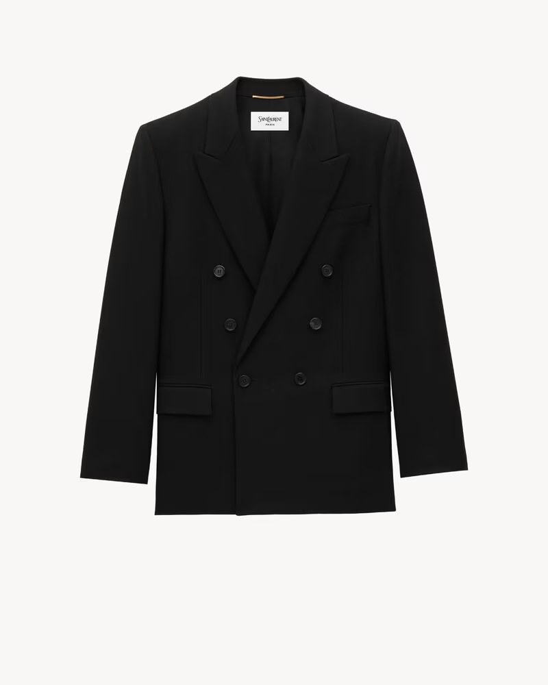 這款來自 Saint Laurent 的黑色雙排扣西裝外套呈現經典俐落的輪廓,具有明顯的肩線與尖銳翻領,展現品牌一貫的態度。六顆對稱排釦與修身剪裁強調身形,是正式場合或高端時尚造型的首選。(商品售價:NTD104,800)