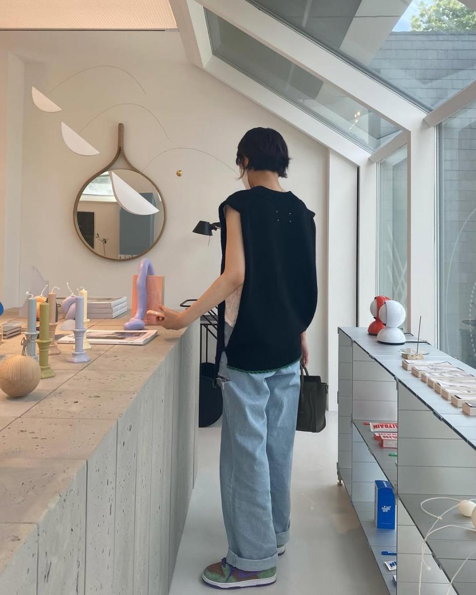 朴圭瑛許多搭配中,都會巧妙的「留白」,例如上一套 Satur 的針織衫搭配,即便是兩式的層次穿搭,她仍選擇短版、短袖做搭配,藉由露出肌膚,創造出呼吸感,而在這張配圖的穿搭,她則挑選 Maison Margiela 的外罩背心做搭配,加上內搭白背心露出手臂,以及兩件服裝間創造的鬆身感,皆讓她的搭配有一種呼吸感。