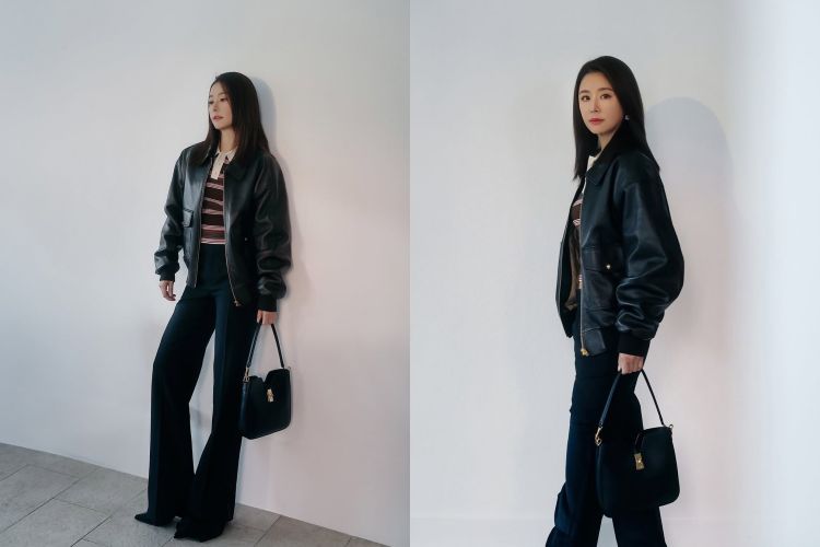 林心如減齡穿搭3:黑色皮革飛行夾克定+條紋針織Polo衫+高腰喇叭褲