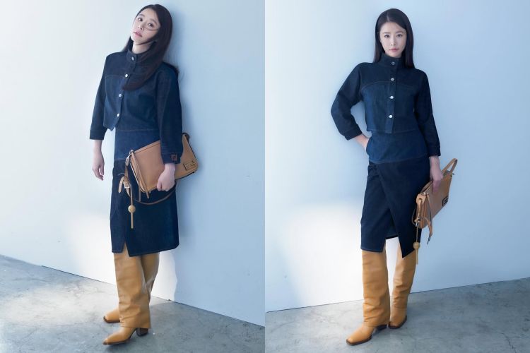這套穿搭用線條說話、用材質定調。Fendi短版牛仔外套帶有微A字版型,同時保持上身重心集中、不壓垮比例。下身同樣選穿牛仔貼身身裙,靴子選的則是焦糖奶茶色襪套式皮革長靴,粗跟穩健好走,暖色把冷調丹寧拉回秋冬氛圍,也讓整套造型更有記憶點。最後以駝色皮革方包、搭配俏皮棒棒糖包包吊飾收尾,屬於看似簡單、其實精算過的比例穿搭。