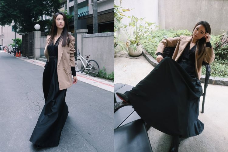 林心如減齡穿搭5:Max Mara駝色西裝外套+黑色連身長洋裝
