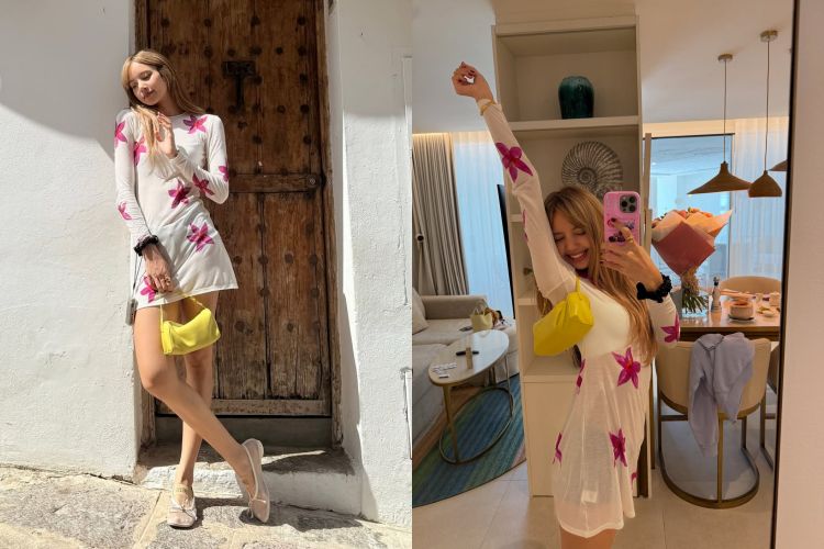 • Lisa洋裝穿搭2:白色花卉洋裝+亮黃色肩背包+網狀芭蕾舞鞋