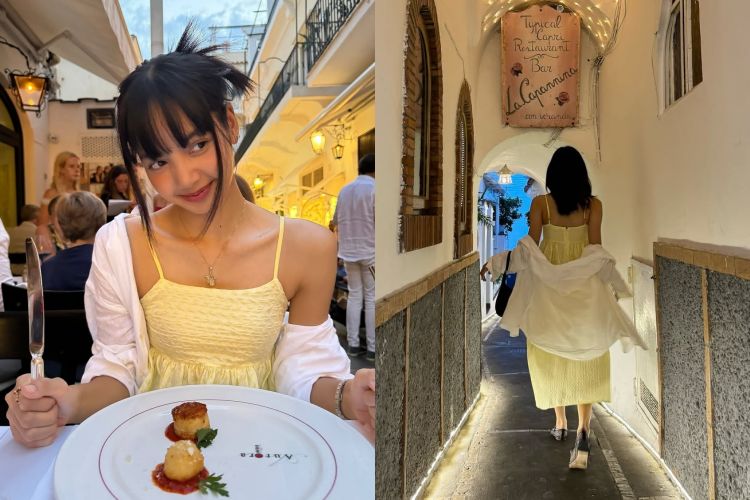 這套黃色細肩帶洋裝,本身線條簡單、色彩清新,若單穿容易偏向度假或居家感。Lisa選擇在造型中加入輕薄白色外搭,刻意不完整穿好,而是自然披掛在肩上,讓洋裝在行走之間多了一層流動感,也替肩頸線條留出呼吸空間。作為視覺節奏的調節,讓洋裝從白天延伸到夜晚餐敘都依然成立。對於細肩帶或柔軟材質的洋裝來說,適度加入外搭,是讓造型更耐看、也更有場景感的關鍵。