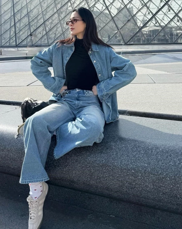 再不少牛仔褲的剪裁款式裡,我本身對於微喇叭牛仔褲情有獨鍾,因為它不只是腿型的最佳修飾利器,其自然弧線的拉提效果,也能瞬間讓穿者的身型看上去性感又苗條。至於材質上,讀者們可選擇如鄺玲玲這張牛仔穿搭照一樣,以略帶硬挺材質的微喇褲,讓雙腿線條更筆直、顯高又有氣場,完全不需要多餘裝飾,就能展現俐落又自信的都市時尚感。