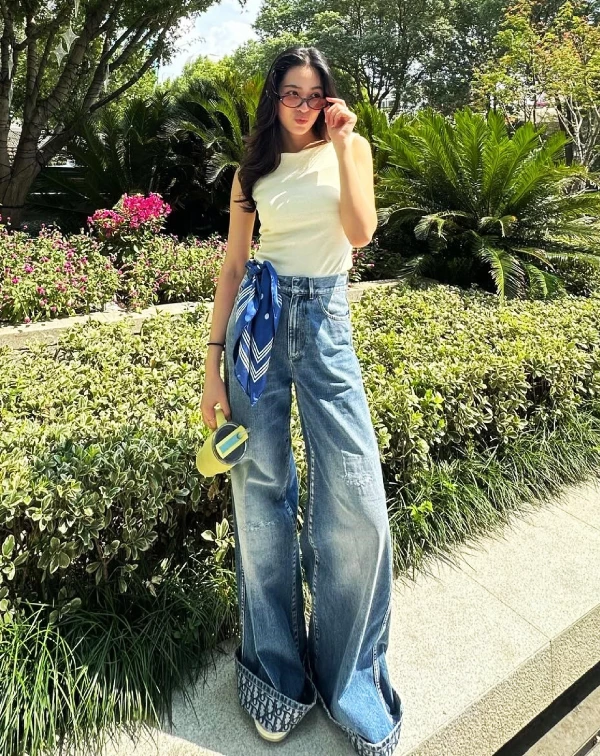 如果說低腰褲穿的是態度,高腰牛仔寬褲演繹的就是「氣場」與「比例」。鄺玲玲巧妙以淺色系的削肩背心搭配高腰闊腿褲,將上衣完全紮入褲腰,並在腰間繫上藍色絲巾點綴,為硬挺丹寧注入靈動柔美,展現出走路有風的率性。而基於這套造型,我們就可以從中學習她「強調腰線」的核心技巧—將薄針織、背心…等上衣紮入褲頭,就是優化比例的不二法門。最後,只需要再搭配厚底鞋或尖頭鞋隱藏在寬大褲腳下,就能在無形中延伸視覺長度、輕鬆穿出自信又高挑的丹寧美學!