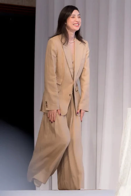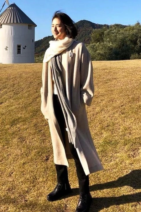 在這片春陽灑落的草地上,天海祐希選穿了一件奶茶色長版大衣,這類「比純白多一點溫度、比深灰更能提氣色」的溫潤色系,對於普遍亞洲人膚色真的很友善,簡直自帶柔焦濾鏡,熟齡女性穿起來特別顯白又顯質感。她還很聰明地用米白與燕麥灰的雙色圍巾做層次疊搭,把視覺自然往上拉,使整個人看起來更加修長、有精神。下半身則用黑色合身長褲修飾比例,也讓長版大衣不顯厚重,反而多了幾分俐落帥氣。這套「大地色系+層次疊穿」的搭配,讓59歲的她既溫柔又帶點英氣,也再次教會我們:只要抓對色調、比例和一點細節,也能穿出這種看似不費力的高級感。