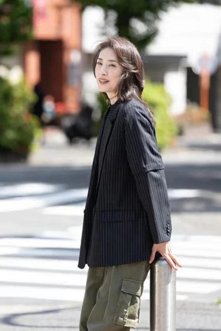 一件帶點正式感的深色直條紋西裝外套,卻搭配軍綠色多口袋工裝褲,整個就是「上半身開會、下半身去露營」的反差組合,這套混搭真的是我私心最愛!也讓我更佩服天海祐希的穿著品味了,她完美示範怎麼打破刻板印象,把看似南轅北轍的單品搭出超有質感的高級感。最後踩上一雙厚底白球鞋,將正式與休閒的比例拿捏得恰到好處。