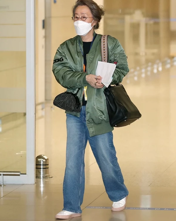 尹汝貞再度用一件帥氣的飛行員夾克,搭配刷色牛仔褲,完美平衡了中性帥氣與熟齡的優雅。