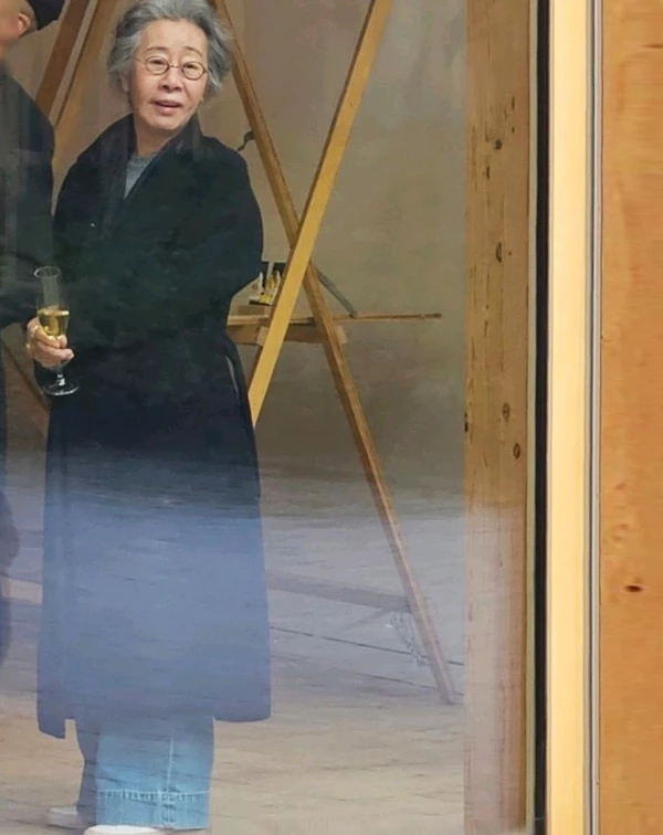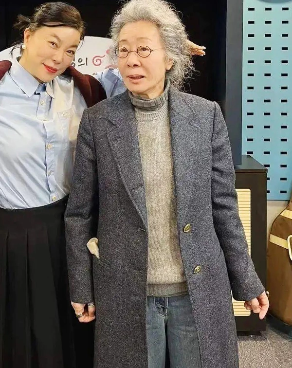 這套造型,再次印證了尹汝貞的穿搭哲學:「牛仔褲,就是熟齡族最棒的防腐劑」。即便上半身穿著厚實的灰色毛呢大衣與深色高領,容易顯得嚴肅沉重,她卻聰明地換上一條經典直筒牛仔褲,瞬間將「長輩感」轉化為知性又帥氣的藝術家氣息,完美達成視覺減齡。