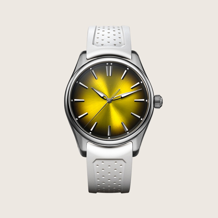 這世界上沒有幾只錶,能像 H. Moser & Cie. 亨利慕時的「太陽蛋」一樣帥氣又有梗。這枚名為 Pioneer Centre Seconds Sunny-Side Up 的開拓者大三針太陽蛋腕錶,將黃色煙燻錶盤「煎得」恰到好處,從中心向外擴散的放射狀紋理,彷彿蛋黃冒著熱氣。搭載 HMC 201 自動機芯,擁有72小時動力儲存,結構實在卻一點也不沉悶。白色橡膠錶帶為整體增添清爽運動感,錶殼則選用拋光不鏽鋼,結合細膩雕琢與簡約線條。這不是一只需要高聲宣告的腕錶,它讓懂的人會心一笑,讓不懂的人多看一眼。(價格 NTD 561,000)