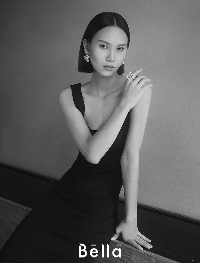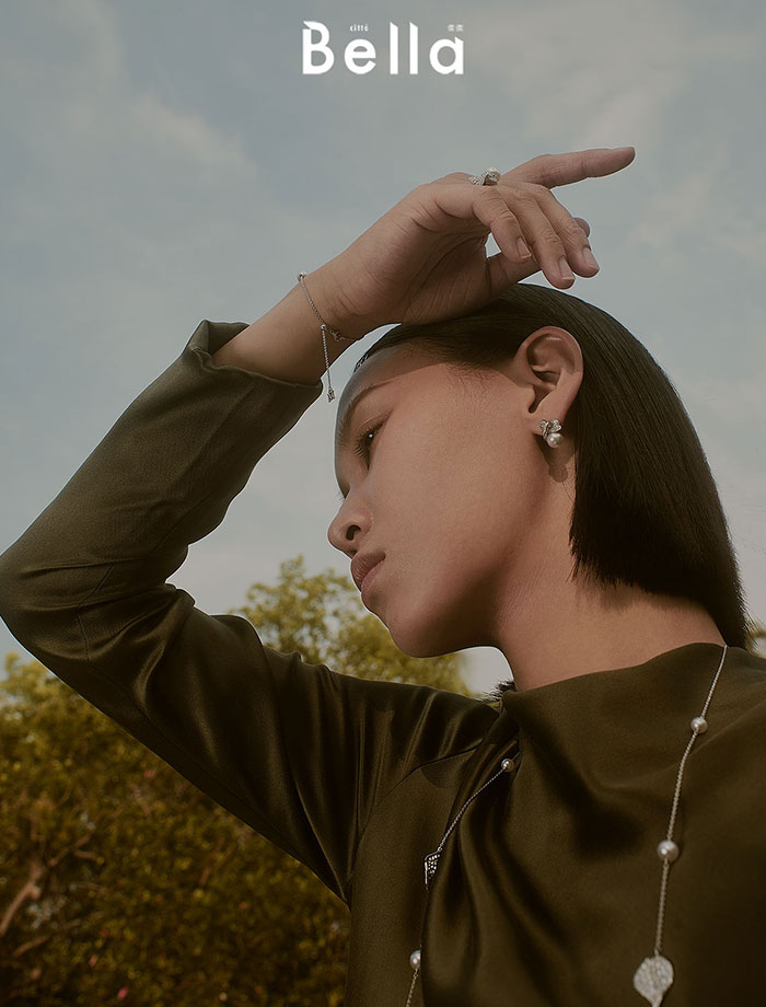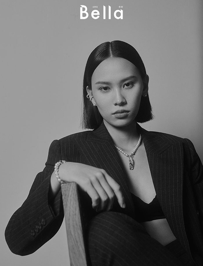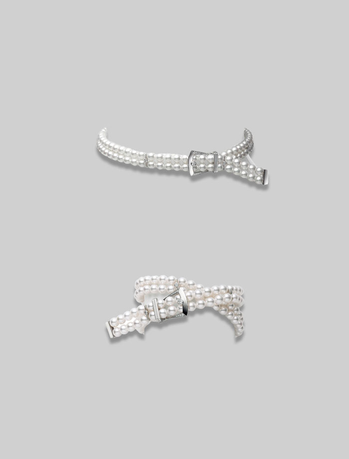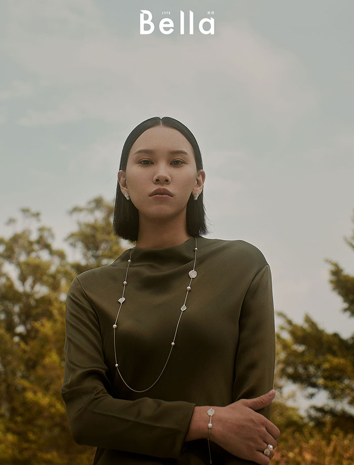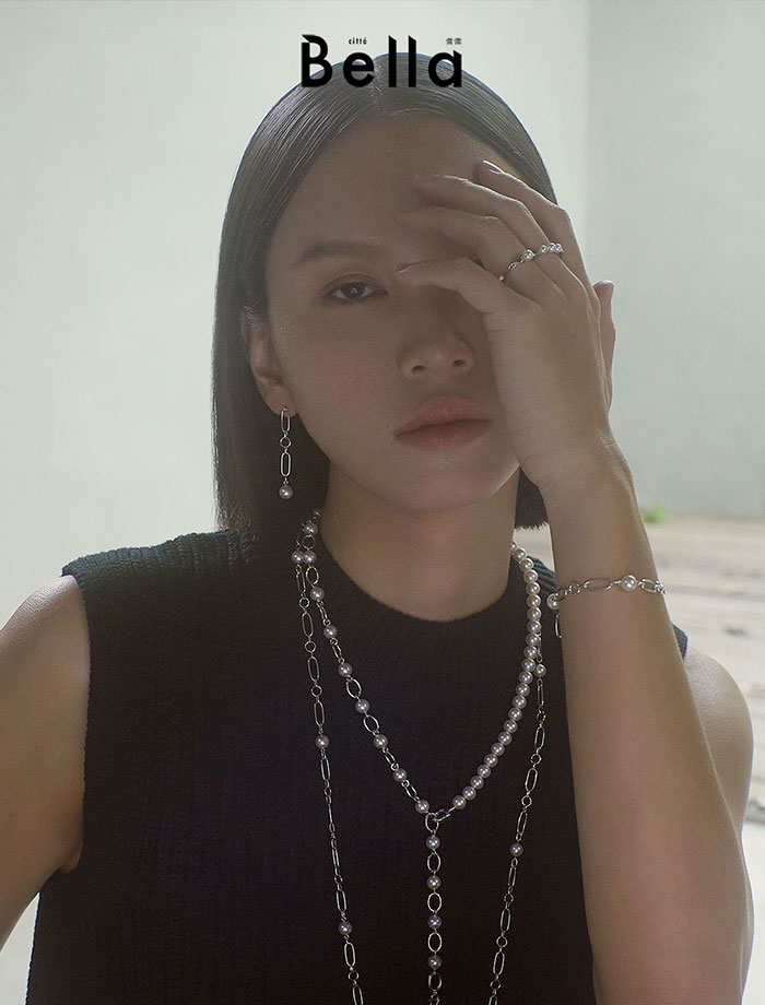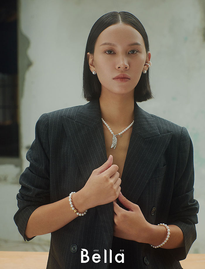 以幹練的灰色條紋西裝,搭配珍珠項鍊作線條對比,Boucle Précieuse系列頸鍊既可以是Choker、亦能變作手鍊配戴,一件多穿、可輕易變換造型。